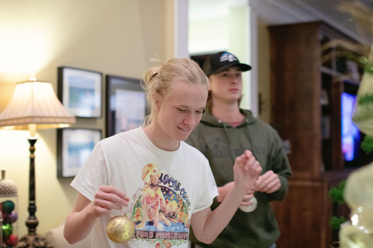 The tree had been up for weeks half decorated waiting for the boys to both be home from school and available, not like they really cared, but it’s tradition. They were more interested in the hot cocoa and popcorn that followed.I love having these two together, especially over the holidays! The finished product…
