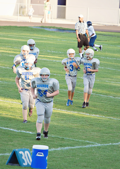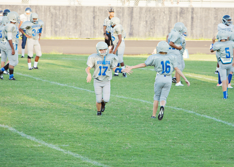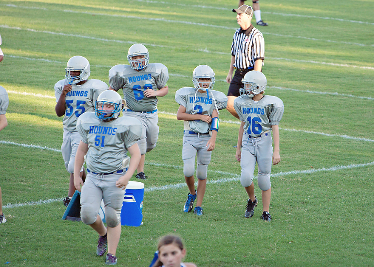 Max was blocking for him, and they somehow ended up tangled up. That’s much better than getting smooshed!They won a very exciting first game, 26 to 8. Go Hounds!!!!