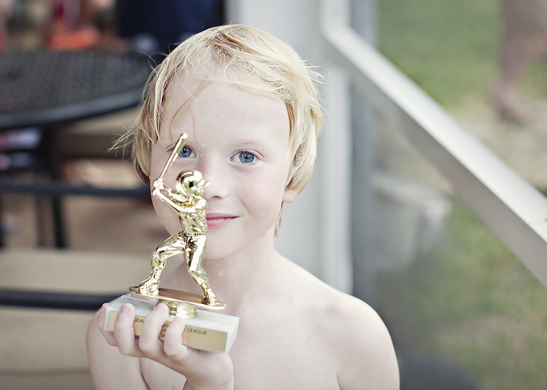 Tonight we had the end of season party for the Cardinals. They had pizza, swimming, and trophies. Who could ask for more than that? Coach/Daddy brought it in one last time, and Jackson was all over it.