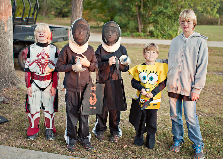 Tonight, we’ve been sitting around like it isn’t Halloween or something! Here are a few more pictures from when we were celebrating. Some of the kids came over a little early, so I had to get a group pic. Also, another one more of my football player and Commander Fox peeking an eye out at me.