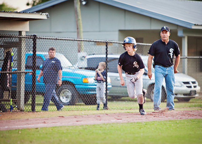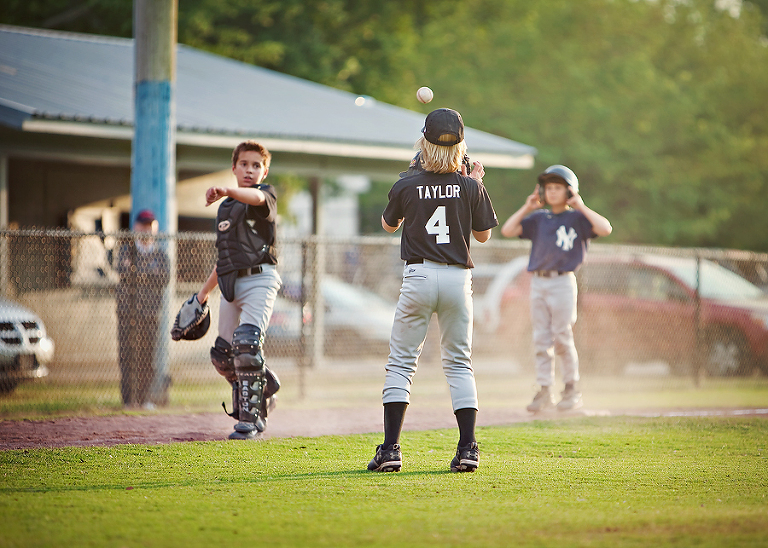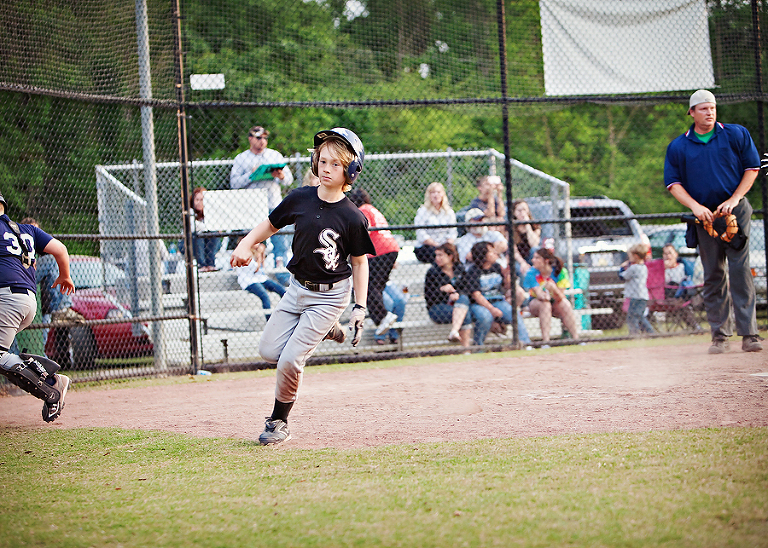 I took a few pictures, then went back out to the stands. When I realized he was on third, I knew my baby well enough to know that the second there was a passed ball, he was stealing home, so I raced back out there with camera in hand. I needed to get a good shot of him sliding home.