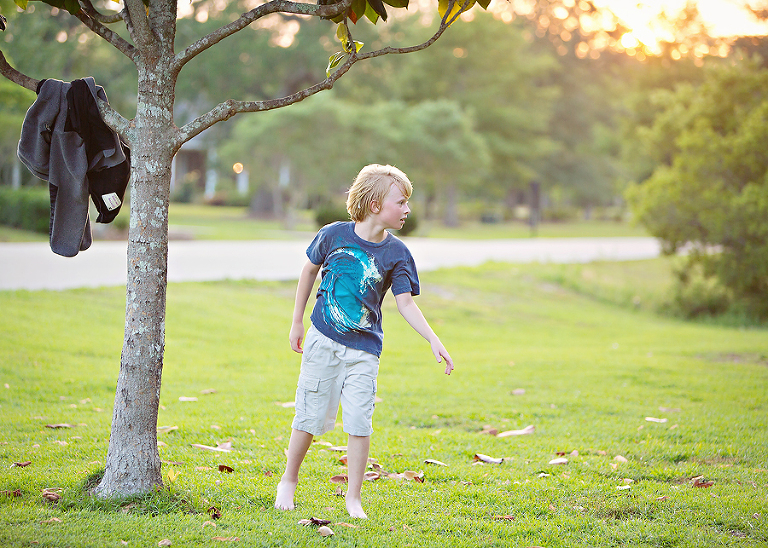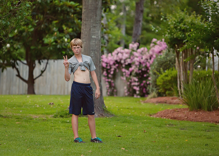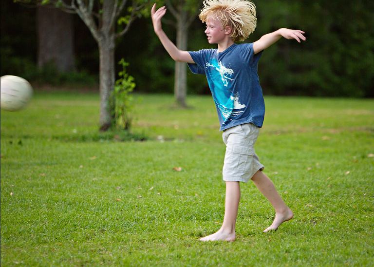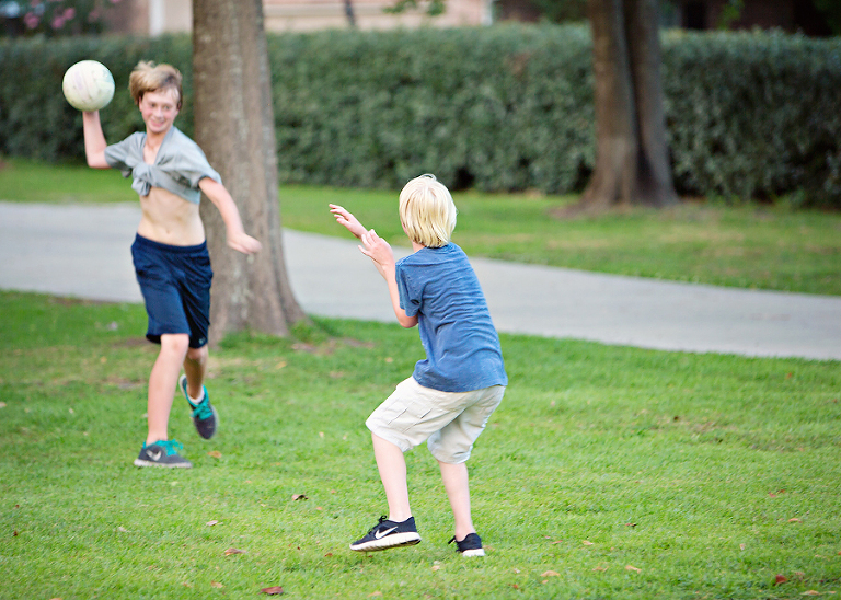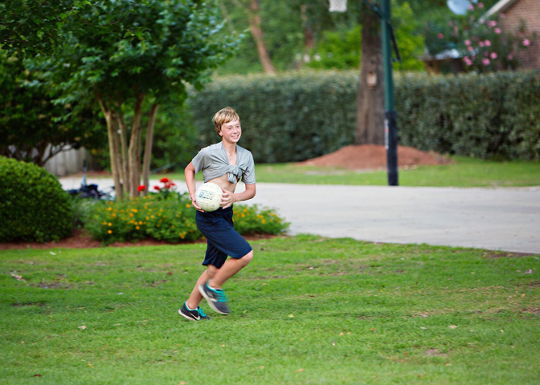 The boys (Scott included) have been playing kickball and stick-ball a lot this summer. Kickball was the game of choice today. Jackson made it to first. I love it when I call their name, and they forget I have a camera and look over at me.