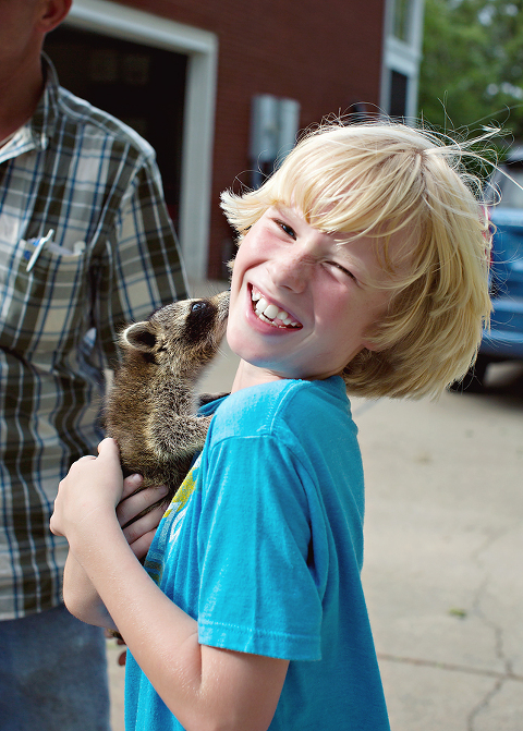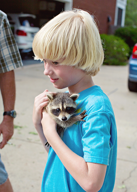 I’m supposed to be catching up, but I just had to share these immediately. Chris, our neighborhood landscape guy, is raising a baby raccoon, and we have fallen in love with it. Rocky has already had her shots, so we were happy to have her hang out at our house for a few hours yesterday. I was so worried the boys would lose her, but she followed them everywhere they went.