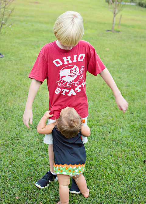 Maw Maw & Paw Paw had a cookout at their house Saturday. Christian and Scott were hunting, but Jackson and I are always ready for a cookout. After I ate enormous amounts of food from which I am still recovering and trying to ween myself off of, we went outside to watch the girls play. They LOVE Jackson. I mean, I totally get it, but seriously they can’t get enough of him. Colbie will just walk up to him, grab him, and hug him. It’s so sweet. See Jackson’s cheeks? He loves it, too.