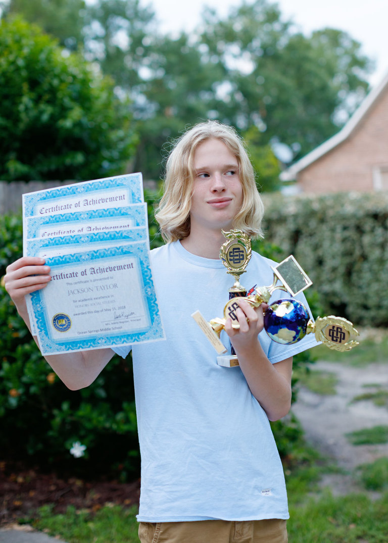 We got the invitation for awards this year, and as always, we never know what he’s going to get. The competition in Ocean Springs is fierce. I mean, I know his grades are stupid awesome, but sometimes a 100 isn’t the best grade anymore, crazy, right? When we asked him what he expected, he said I don’t know, maybe ICT and Principals list. Well, in typical Taylor kid form, he underestimated himself. He sat with us instead of the kids, so there were some adults at the end of our row. When they started handing out awards, they kept calling his name. Even Coach Smith asked him if his legs were tired from walking up there. Finally after a few awards, they announced a new category, and the lady beside him leaned over and asked, “Are you good at Science, too?” Jackson just gave her a little smile and look, like well, yeah, kinda. The paper awards were for academic excellence in a subject, the trophies were for highest averages. My baby killed it. He ended up with awards in French, Computers, Honors Social Studies, and Algebra, his trophies were for Computers, French and Algebra. He liked the French one the best.