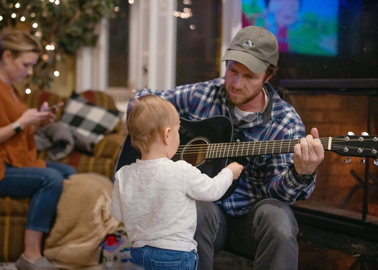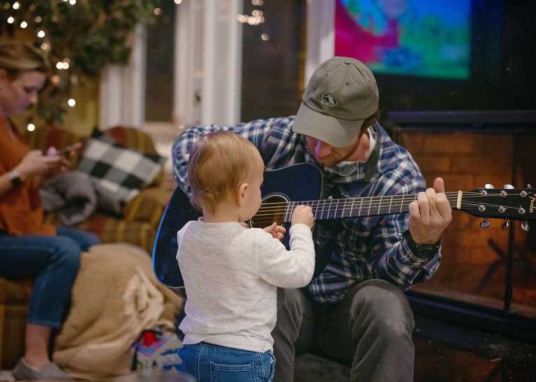 Ok, so there were other people there, too, but Wyatt was the main focus. We had all the Campbell kid’s in the house! It was rainy and extremely cold, so we only braved it outside for a few minutes, then came back inside to warm up by the fire. Y’all don’t even KNOW how cute my nephew is!Scott showed him the pier, while Lindsay and I froze to death.We warmed up before a nap by the fire watching a little Baby Bum or something like that.Later, he helped Brad play guitar.He is so helpful.Nana and Uncle Scott’s house is fun, but just wait until summer! There will be swimming and boat rides!